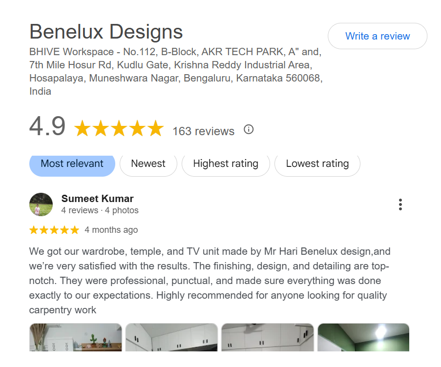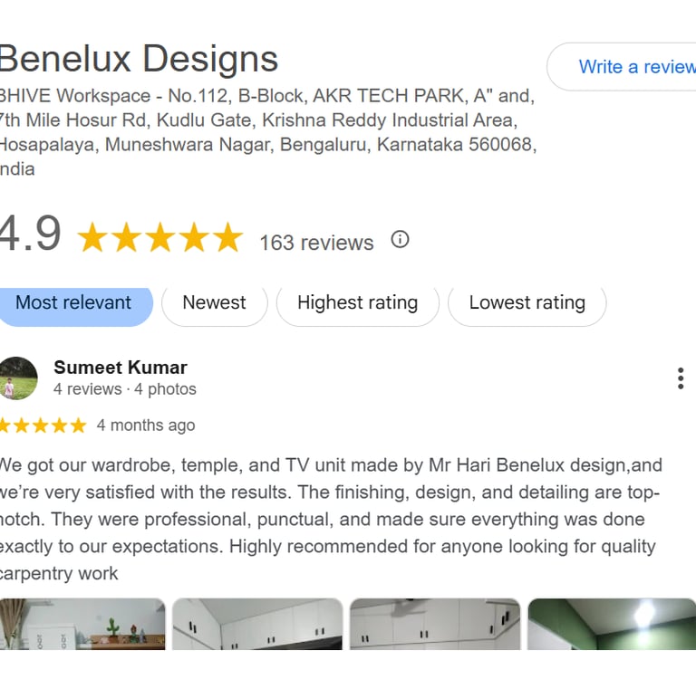 We got our wardrobe, temple, and TV unit made by Mr Hari Benelux design,and we’re very satisfied with the results. The finishing, design, and detailing are top-notch. They were professional, punctual, and made sure everything was done exactly to our expectations. Highly recommended for anyone looking for quality carpentry work